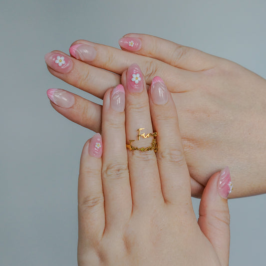 Pour retirer tes press-on nails, c'est très simple. Trempe tes mains dans de l'eau tiède pendant quelques minutes. Ensuite, avec le petit repousse cuticules fourni dans ton kit, fais un léger effet levier entre ton ongle naturel et la capsule. Ça se retire tout doucement et sans douleur. Une fois retirés, range-les dans leur boîte pour ne pas en perdre !