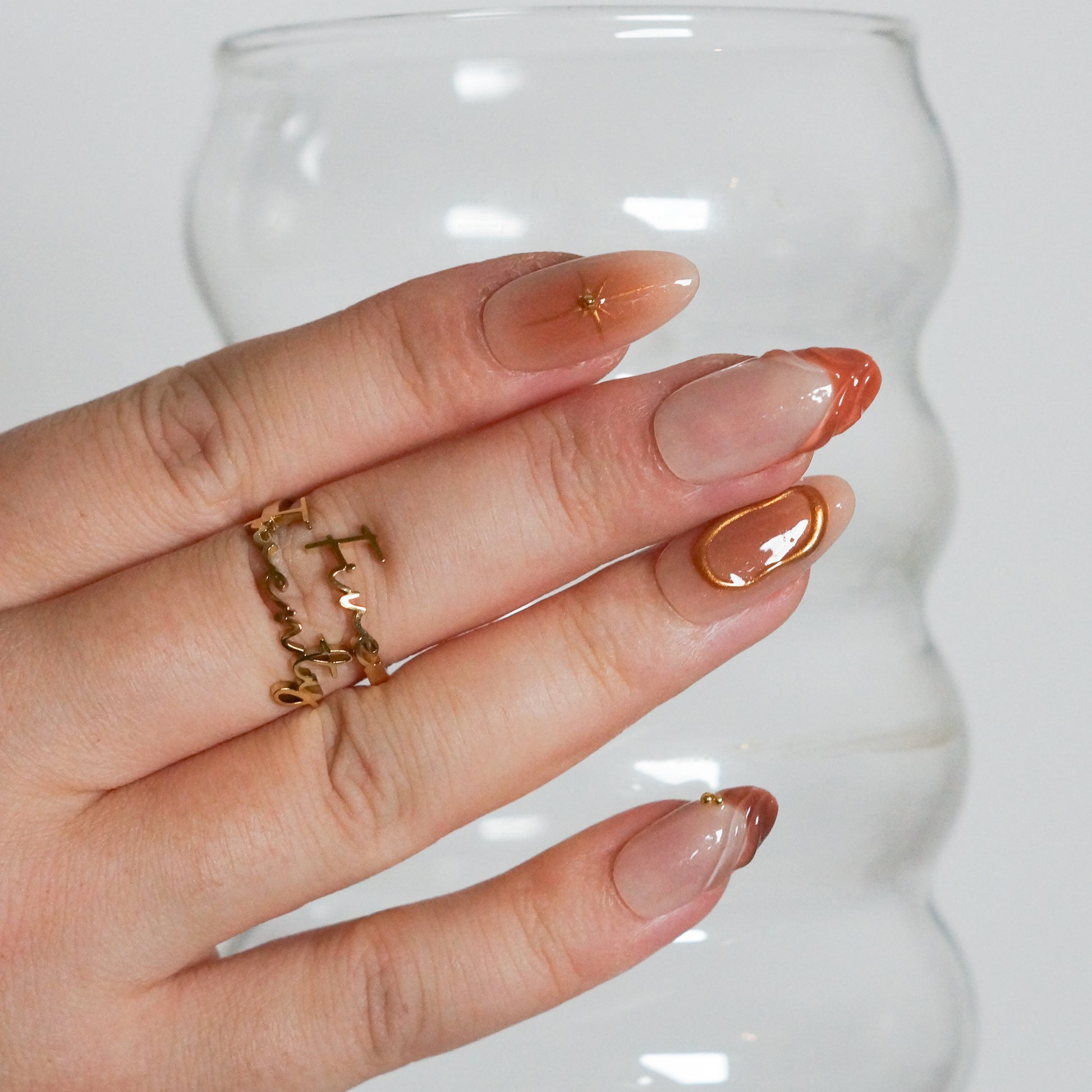 Pour retirer tes press-on nails, c'est très simple. Trempe tes mains dans de l'eau tiède pendant quelques minutes. Ensuite, avec le petit repousse cuticules fourni dans ton kit, fais un léger effet levier entre ton ongle naturel et la capsule. Ça se retire tout doucement et sans douleur. Une fois retirés, range-les dans leur boîte pour ne pas en perdre !