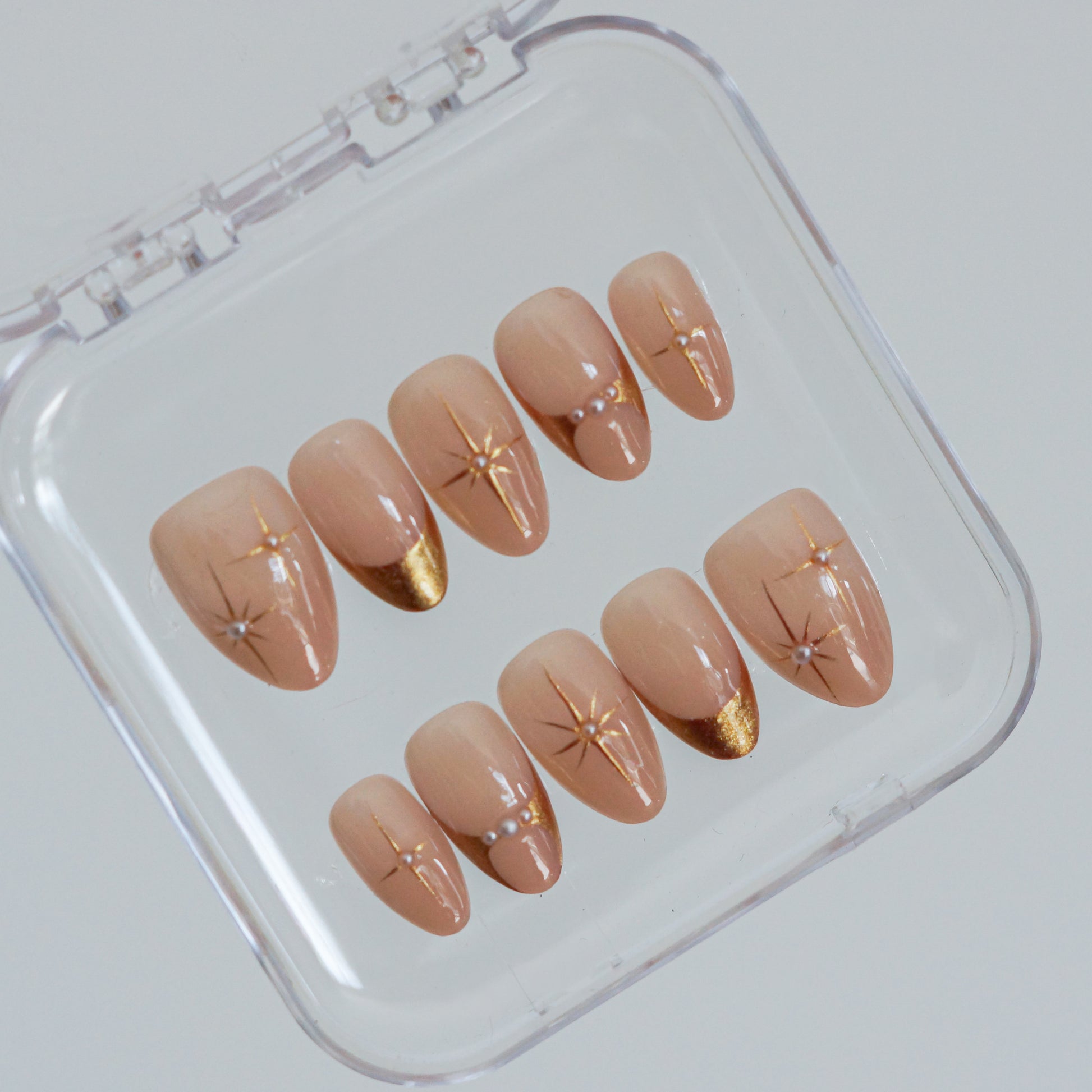 Pour retirer tes press-on nails, c'est très simple. Trempe tes mains dans de l'eau tiède pendant quelques minutes. Ensuite, avec le petit repousse cuticules fourni dans ton kit, fais un léger effet levier entre ton ongle naturel et la capsule. Ça se retire tout doucement et sans douleur. Une fois retirés, range-les dans leur boîte pour ne pas en perdre !