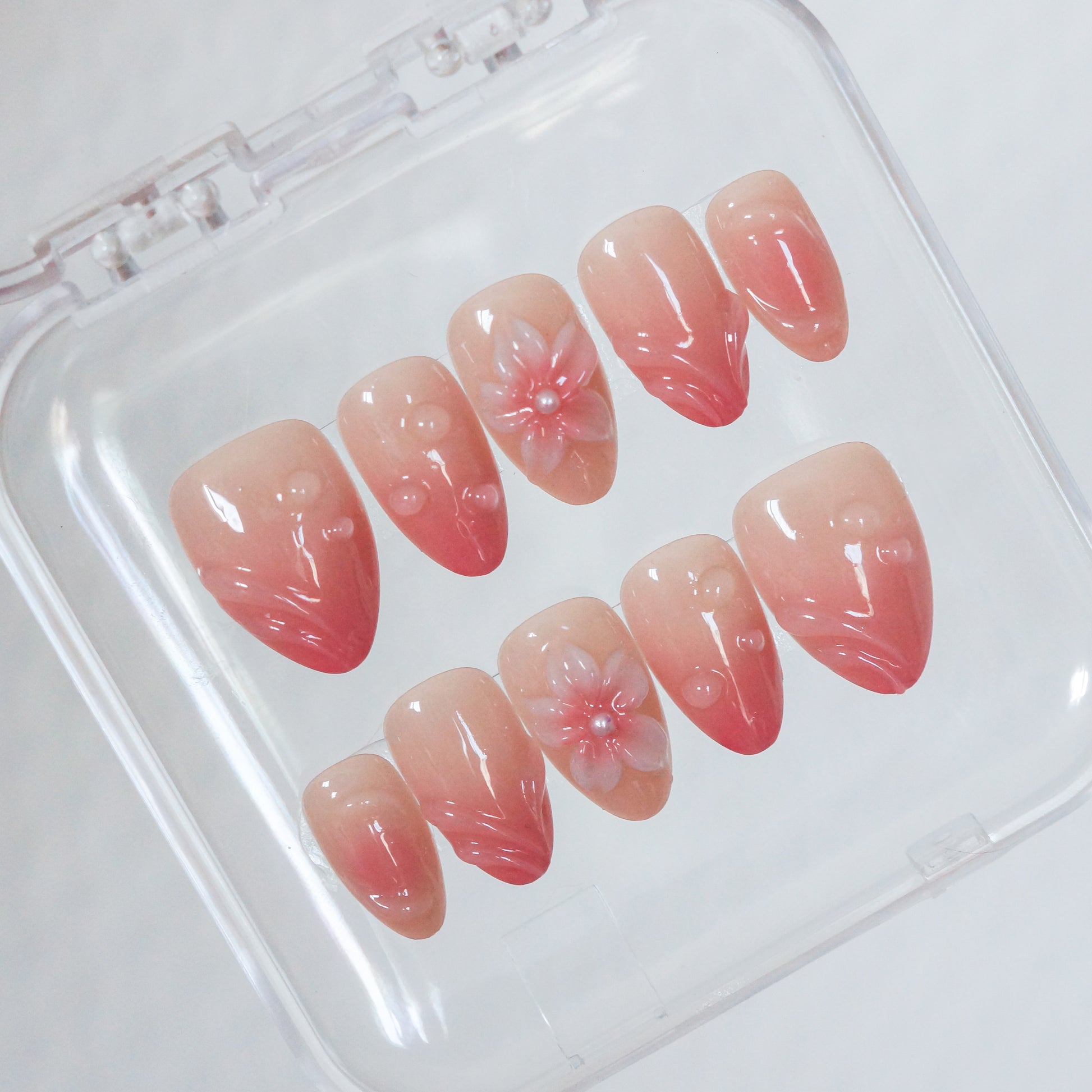 Pour retirer tes press-on nails, c'est très simple. Trempe tes mains dans de l'eau tiède pendant quelques minutes. Ensuite, avec le petit repousse cuticules fourni dans ton kit, fais un léger effet levier entre ton ongle naturel et la capsule. Ça se retire tout doucement et sans douleur. Une fois retirés, range-les dans leur boîte pour ne pas en perdre !