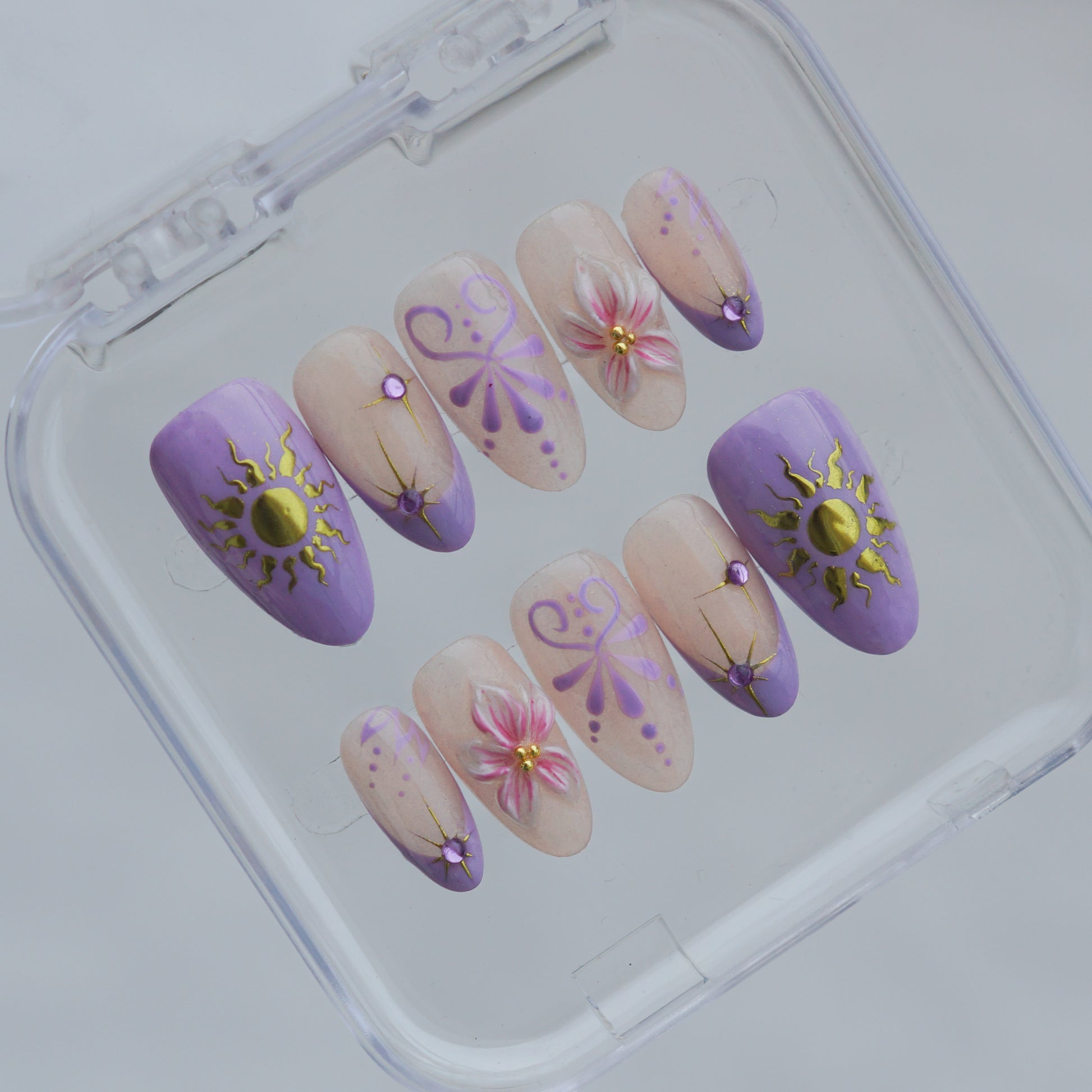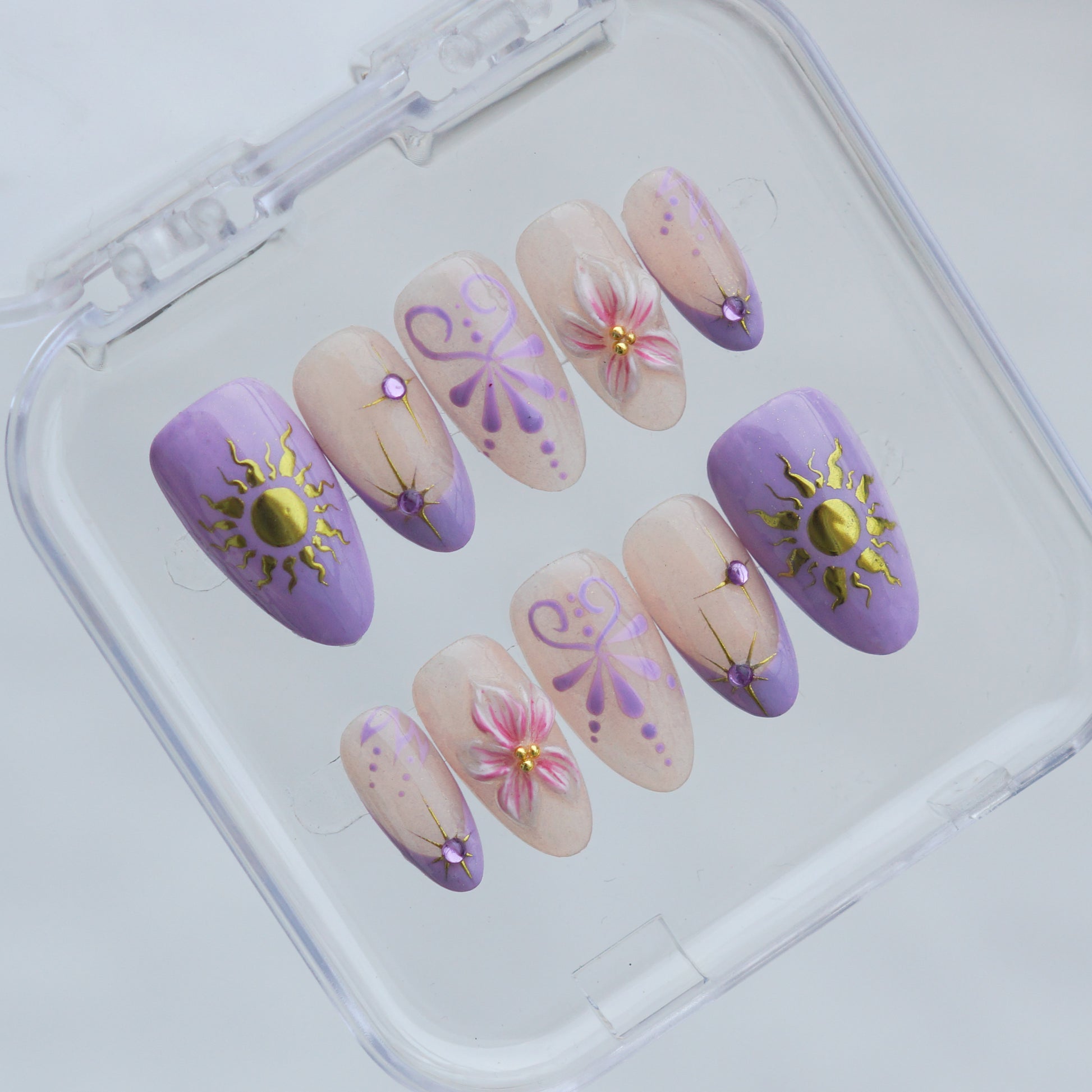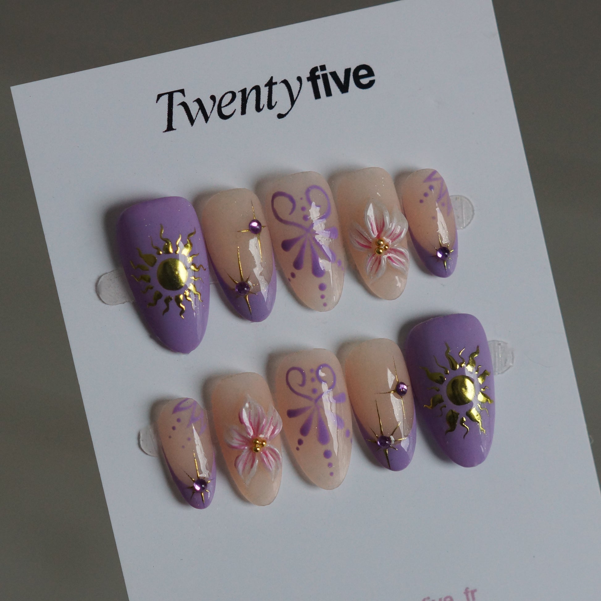 Raiponce est un set de press-on nails qui s’inspire d’une princesse aux cheveux dorés et magiques, enfermée dans sa tour mais pleine de rêves d’aventure. Une manucure idéale pour celles qui veulent apporter une touche de magie et d’élégance au bout des doigts